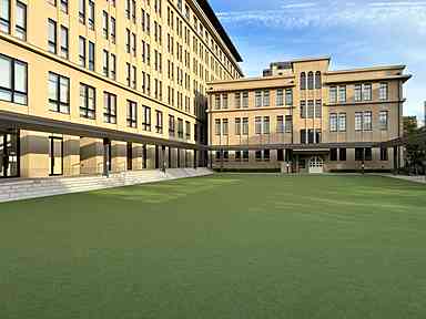 建物の前に広大なスペースに人工芝のひろばがあり、