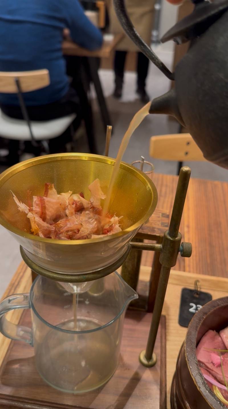 用餐時,需要自己把熱湯倒進漏斗中,讓湯通過鰹魚片,萃取出高湯。